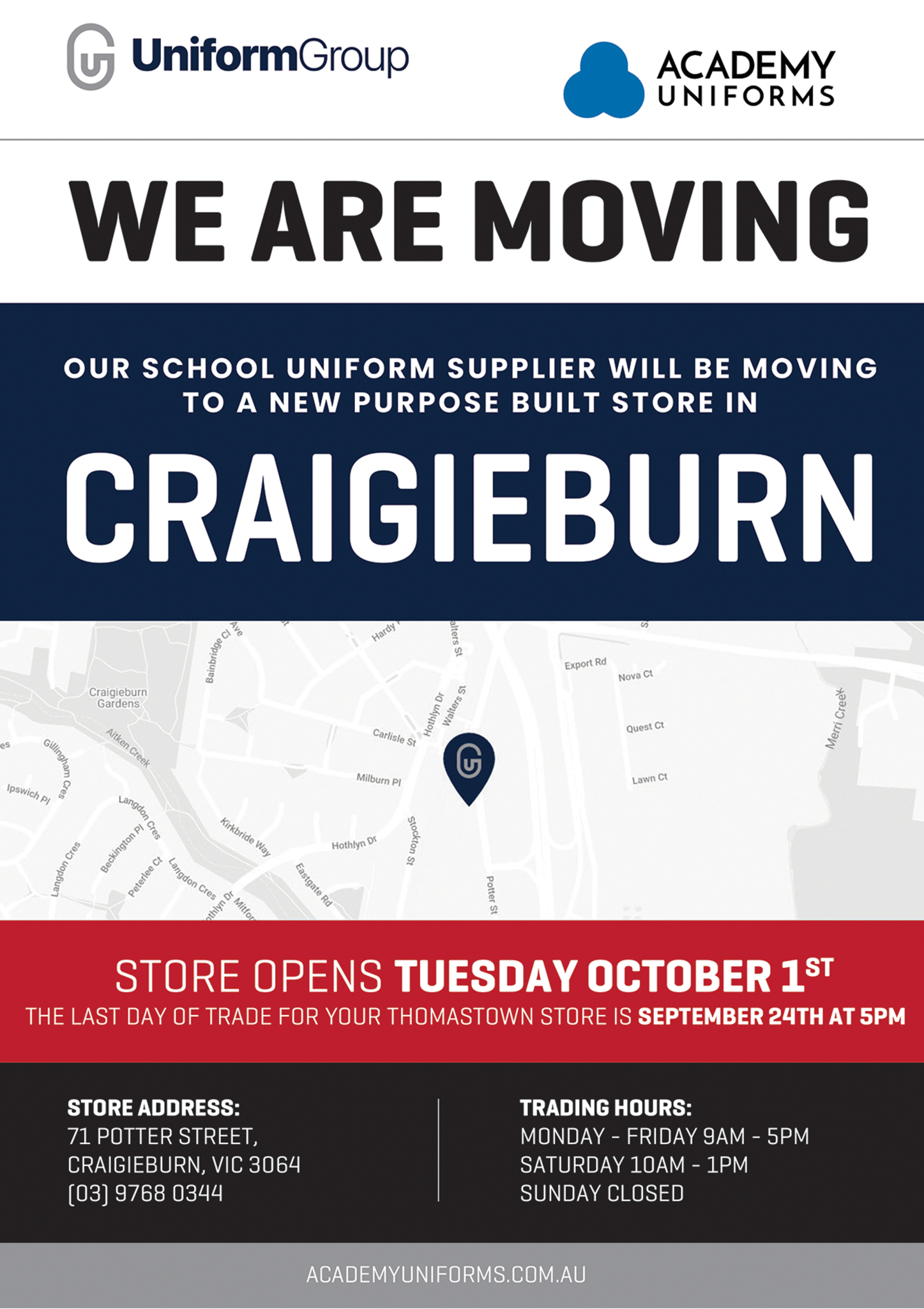 Our uniform supplier, Academy Uniforms, is moving from Thomastown to a brand-new, purpose-built store in Potter Street, Craigieburn, making it even more convenient to get your uniforms sorted!